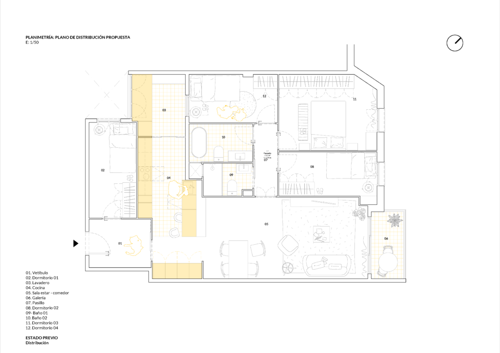 Hablamos de una vivienda en un edificio del año 1973. Su superficie es de 105,90 m². La intervención solo pretendía adecuar la vivienda a las necesidades de su nueva familia, y que el proyecto derribara las mínimas paredes posibles. Se buscaba mantener la distribución interior existente, pero buscando un sentido distinto a la vivienda.