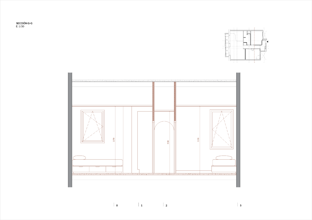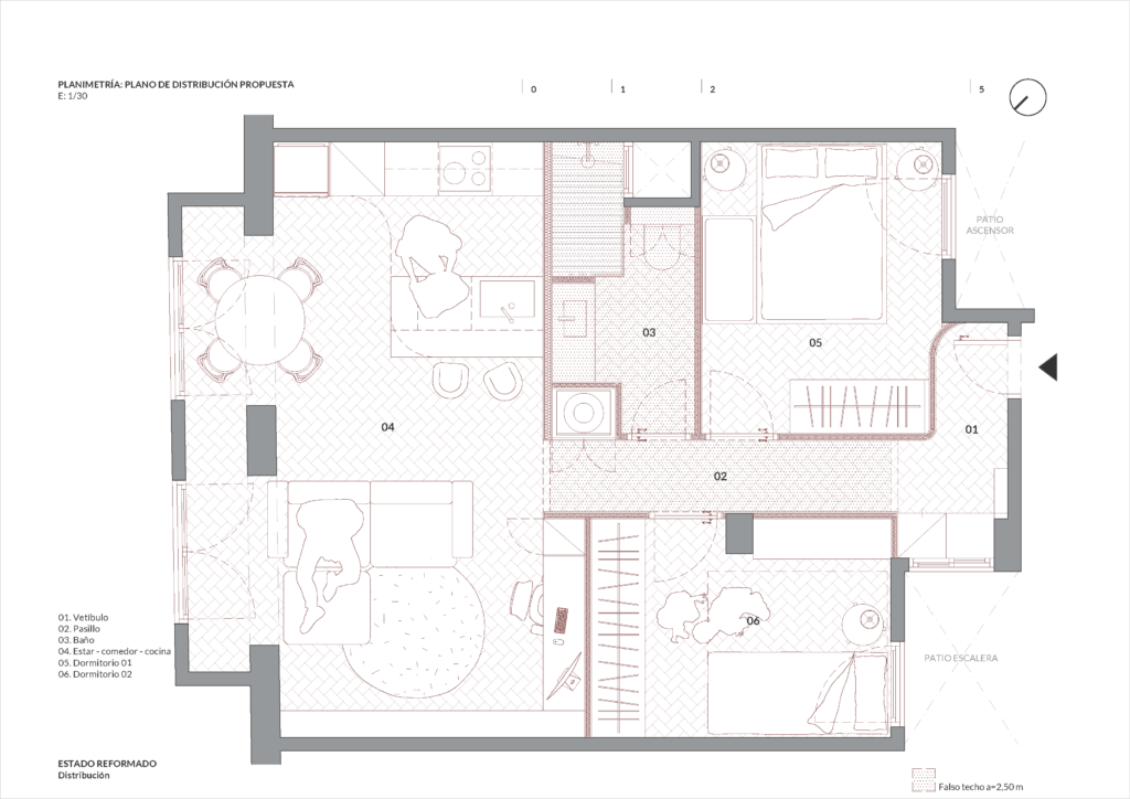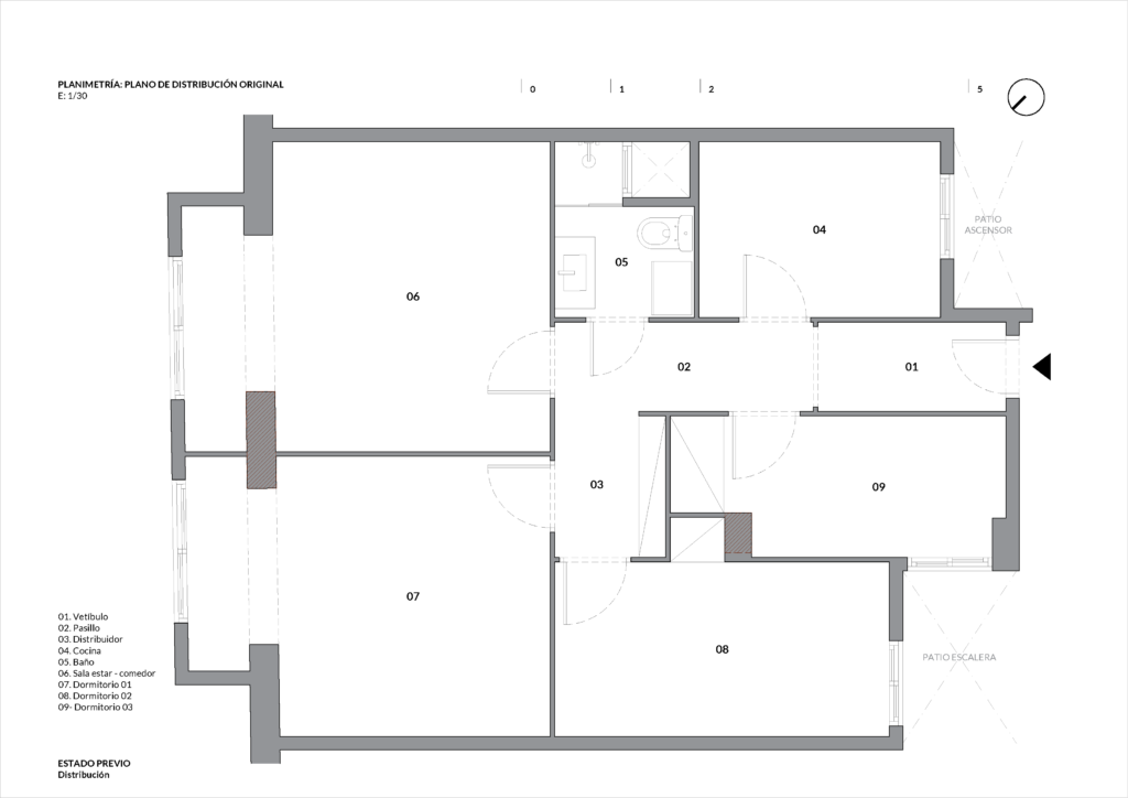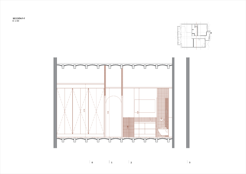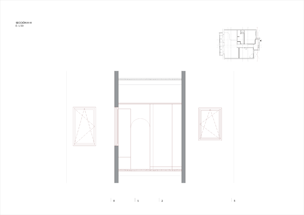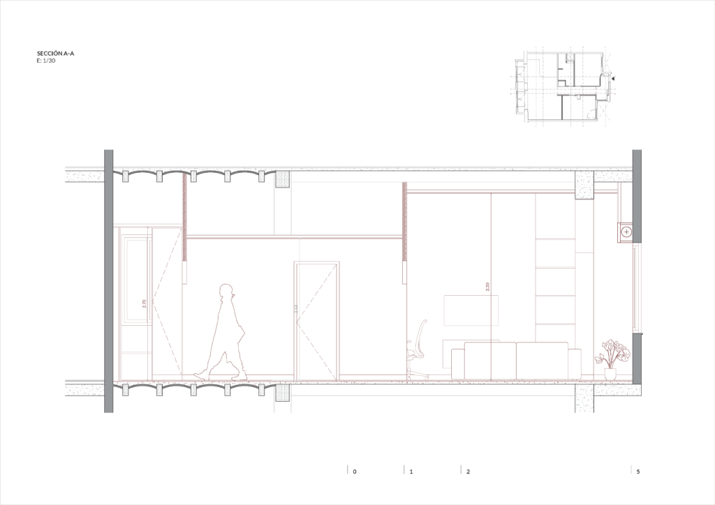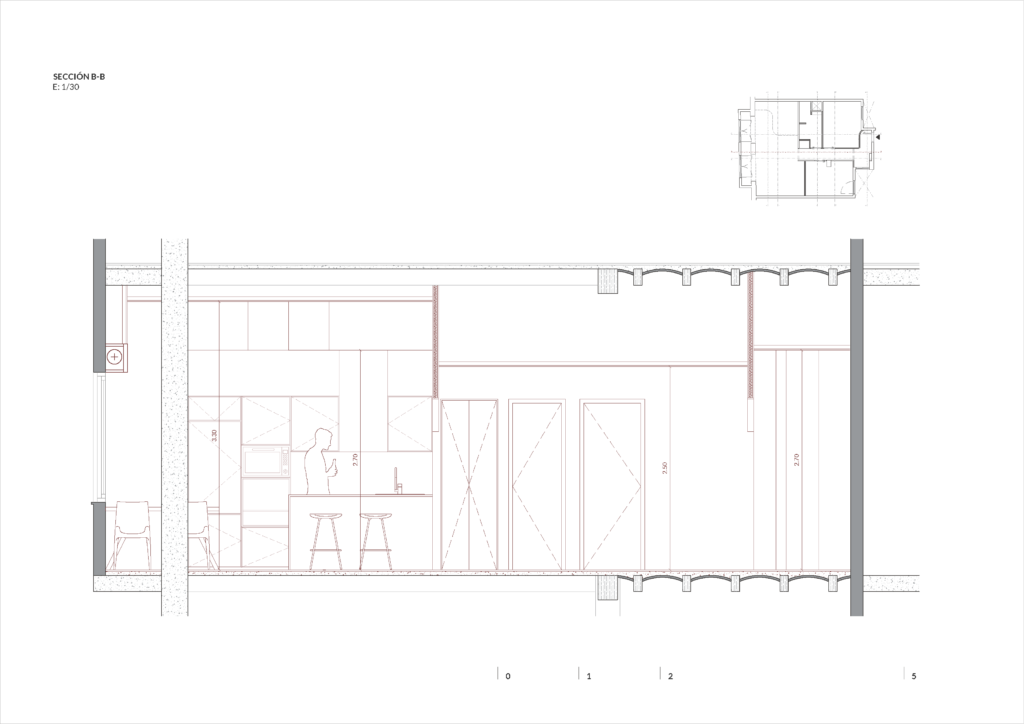 Con la reforma integral se busca abrir la zona común de estar-comedor-cocina ubicando este espacio en el frente de la vivienda, intentando obtener a través de las dos ventanas de fachada la mayor entrada de luz posible. Es en esta sala donde se ubica también el espacio de despacho para poder trabajar des de casa. Ç Los dos dormitorios se ubican en la parte interior de la vivienda. Se alejan las dos estancias del ruido exterior de la calle. Todas las salas se conectan a través de un pequeño pasillo central que da acceso a todos los espacios des de la entrada principal. Junto a los dormitorios se coloca el baño y la zona de lavadero integrado en un armario con acceso des del pasillo.